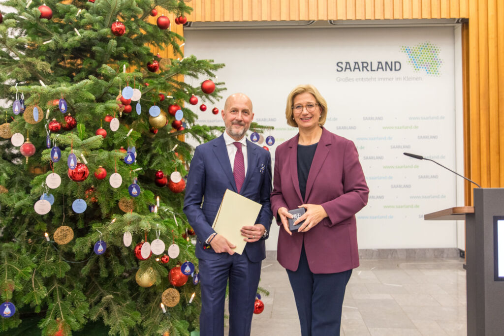 Der Familienunternehmer führte die Hager Group von 2008 bis 2023 als CEO zu einem Umsatz von mehr als 3Mrd.€ und ist heute deren Aufsichtsratsvorsitzender. Die Ministerpräsidentin betonte bei der Verleihung die Bedeutung von Hager als Wirtschafts- und Innovationsfaktor für das Saarland und Brückenbauer zwischen Deutschland und Frankreich.