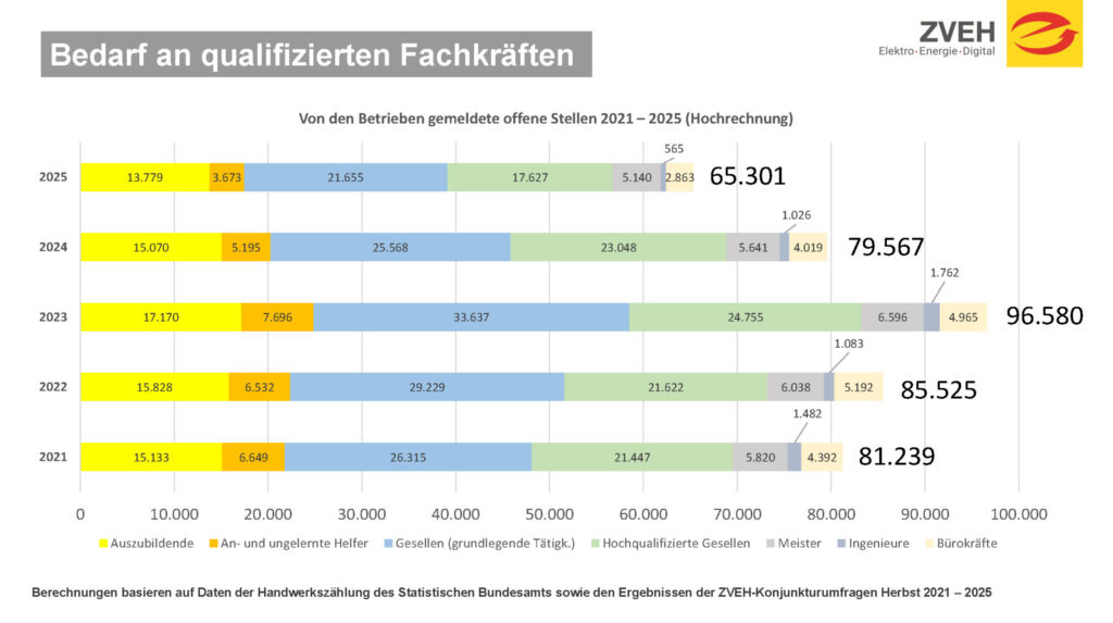 Bereits vor wenigen Wochen zeigte die Herbstkonjunkturumfrage 2025 des Zentralverbandes der Deutschen Elektro- und Informationstechnischen Handwerke (ZVEH): Die Unternehmen sind im Zuge der gesamtwirtschaftlichen Situation deutlich zurückhaltender geworden, was die Einstellung neuer Mitarbeiter betrifft. Hatten vor zwei Jahren, im Oktober 2023, noch 66 Prozent der Unternehmen angegeben, offene Stellen zu haben, waren es im Oktober 2025 nur noch 46,9 Prozent.