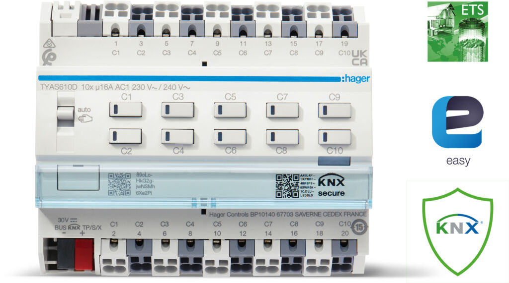 Die neuen KNX Aktoren für die Licht- und Beschattungssteuerung von Hager lassen sich sowohl über ETS als auch über Easy in Betrieb nehmen. Damit strafft Hager sein Portfolio weiter und vereinfacht die Bestellung. Von der Harmonisierung profitiert das Elektrohandwerk auch preislich: Die neuen Aktoren sind im Schnitt 20 Prozent günstiger als die bisherigen Modelle, erklärt das Unternehmen. Zu erkennen sind die neuen Aktoren an der Bestellnummer mit der Buchstabenkombination TY*S.