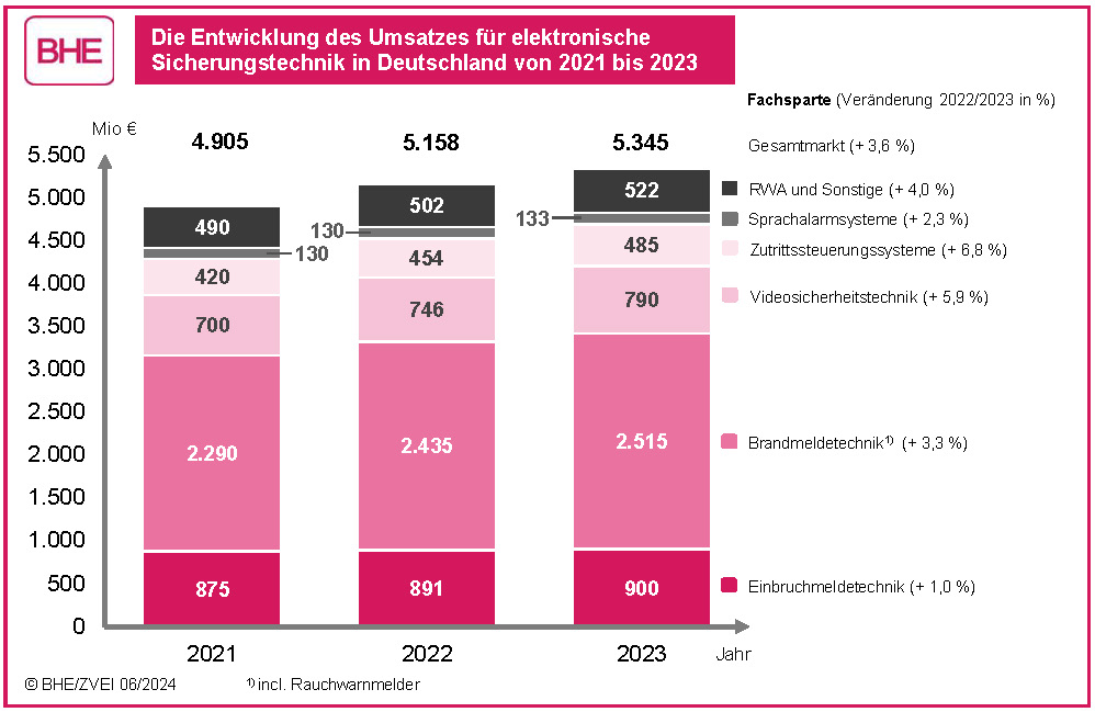 Das Wachstum bei den Überfall- und Einbruchmeldeanlagen fiel 2023 mit plus 1 Prozent auf 900 Millionen Euro wieder etwas schwächer aus. Hier zeige der Wegfall der KfW-Zuschüsse für den privaten Einbruchschutz Wirkung, obwohl die Anzahl der Wohnungseinbrüche zuletzt wieder deutlich angezogen habe.
