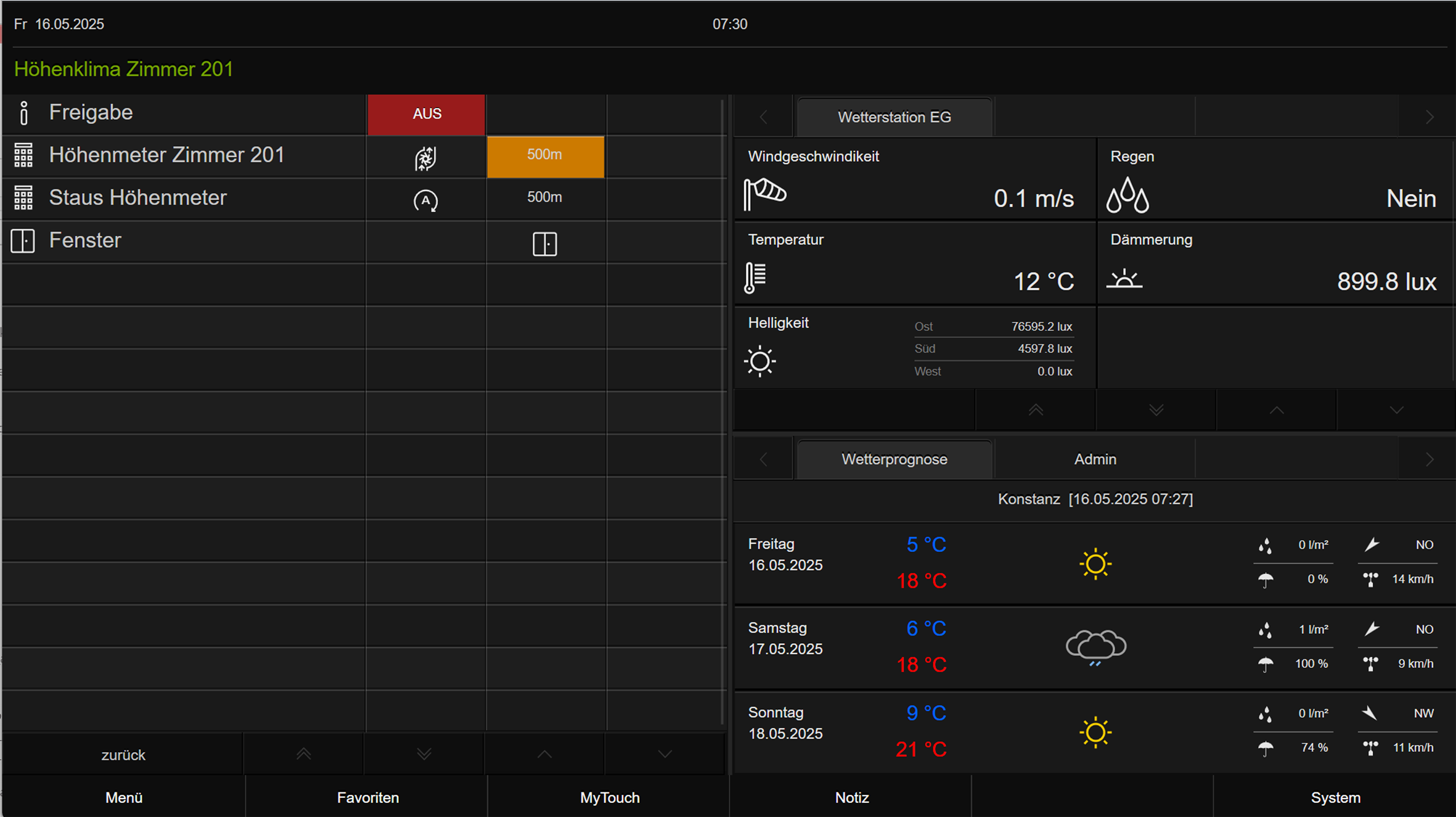 Das Herzstück der technischen Infrastruktur bildet eine modular aufgebaute KNX-Architektur mit sieben autarken Teilprojekten – jedes gesteuert durch einen eigenen Gira HomeServer. Die Teilprojekte sind über Gira F1 miteinander gekoppelt, wobei ausschließlich gefilterte Informationen übermittelt werden. Und zwar nur jene, die auch für die jeweils anderen Teilanlagen relevant sind, wie z.B. die einheitliche Zeitsteuerung der Fassadenbeleuchtung. Diese technische Infrastruktur gewährleistet eine hohe Ausfallsicherheit und die vom Bauherrn gewünschte Autarkie. Selbst bei einer Störung in einem Teilprojekt bleibt die Funktionalität der übrigen Bereiche erhalten. Bedient wird die KNX-Anlage über eine Visualisierungsoberfläche, den Gira QuadClient, die auch Ärzten den Zugriff auf die Einstellparameter des Höhenklimas ermöglicht.
