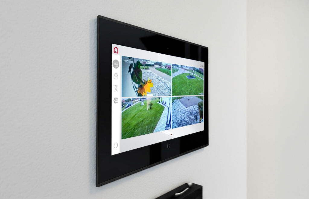 Ein weiterer wichtiger Aspekt bei ihrem Neubauprojekt war für die Bewohner neben dem Komfort und der intuitiven Bedienbarkeit der smarten Steuerungen die Sicherheit. Rund um das Gebäude sind über das Kamera-Modul insgesamt sieben Außenkameras installiert, die das Haus, den Garten und die Garagenbereiche überwachen. Die Aufnahmen werden zentral und übersichtlich über Youvi visualisiert. Die Türkommunikation erfolgt mit Audio- und Türöffnerfunktion über eine Gira-Türsprechstelle, die über das Türstationsmodul angebunden ist. Da der Video-Stream bei Anlagen von Gira nicht von externen Anwendungen abgerufen werden kann, wurde eine separate IP-Netzwerkkamera von Reolink eingebunden. Die Kamera sendet die Livebilder des Eingangsbereichs an das Controlmini, so dass die Bewohner sehen können, wer vor der Tür steht.