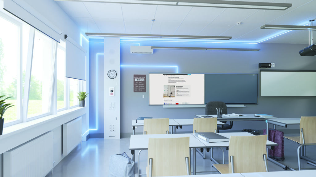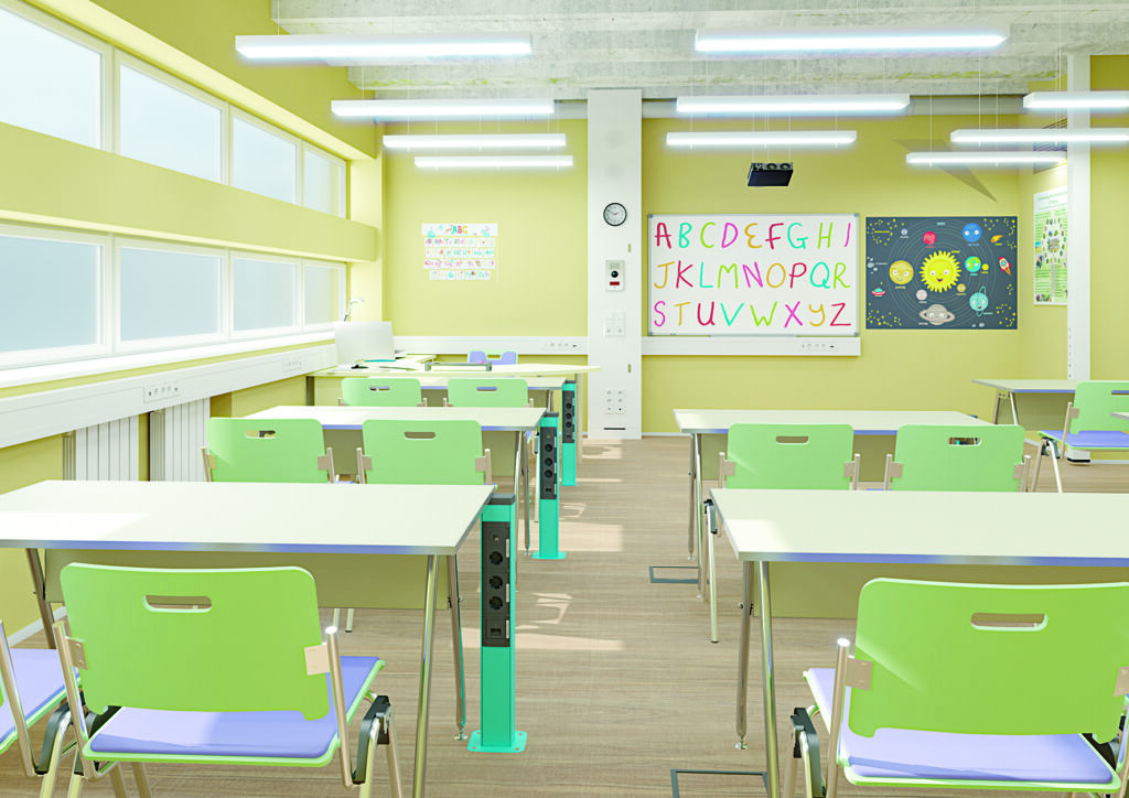 Eine weitere Stärke der Mediensäule liegt darin, dass Hager auch die gesamte elektrotechnische Peripherie aus einer Hand bietet: von der Niederspannungshauptverteilung im Kellergeschoss über Feldverteiler in den Etagen bis hin zu den Volta Installationskleinverteilern. Für die dezentrale Bereitstellung der energie- und datentechnischen Anschlüsse in den Unterrichtsräumen sorgen die wandumlaufenden Brüstungskanalsysteme des Herstellers. Eine weitere Möglichkeit, die Arbeitsplätze der Schülerinnen und Schüler oder das Lehrer-/Rednerpult mit energie- und datentechnischen Anschlüssen zu versorgen, bieten die Bodenanschlusssäulen zur direkten Platzierung an den Schreibtischen.