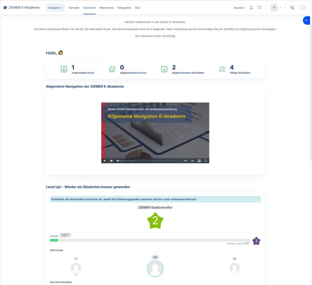 Transparenz und Nachvollziehbarkeit sind wichtige Bestandteile eines erfolgreichen Lernkonzepts: Die Fortschritte der Kursteilnehmenden sind in der Ziemer E-Akademie jederzeit einsehbar, sowohl für die Mitarbeitenden selbst als auch für Vorgesetzte. So lassen sich individuelle Stärken erkennen und gezielt fördern, während Wissenslücken frühzeitig identifiziert und geschlossen werden können. Nach erfolgreichem Abschluss eines Moduls erhalten die Teilnehmenden ein offizielles Zertifikat, welches die neu erworbenen Fähigkeiten nachweist und zu weiteren Kursabschlüssen motiviert. Diese Zertifikate dienen auch als wertvolle Dokumentation für Qualitätsnachweise gegenüber Kunden und Partnern.