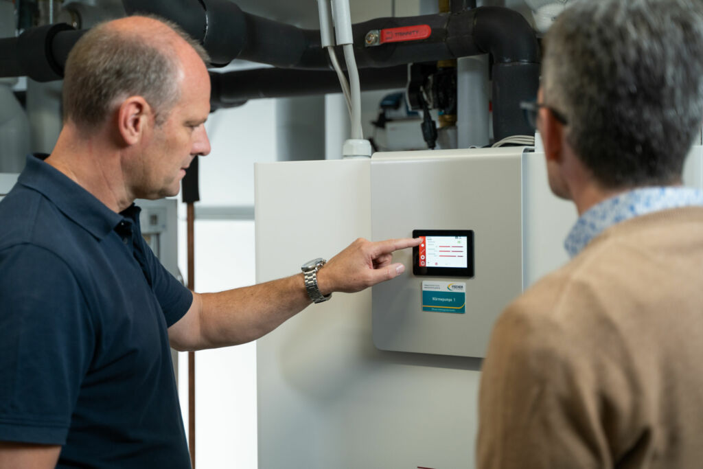 Wolfgang Fischer, Geschäftsführer der Hans Fischer GmbH (links), brachte die Idee des kalten Nahwärmenetzes aufgrund der engen Platzverhältnisse vor Ort in das Projekt. Bild: ©Stiebel Eltron