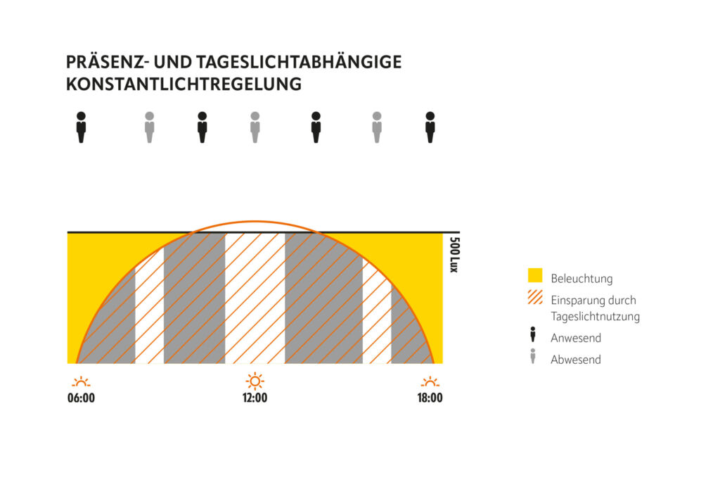 Die Konstantlichtregelung ist die energieeffizienteste Form der Tageslichtnutzung bei einer klassischen Beleuchtung mit gleichbleibender Lichtfarbe.