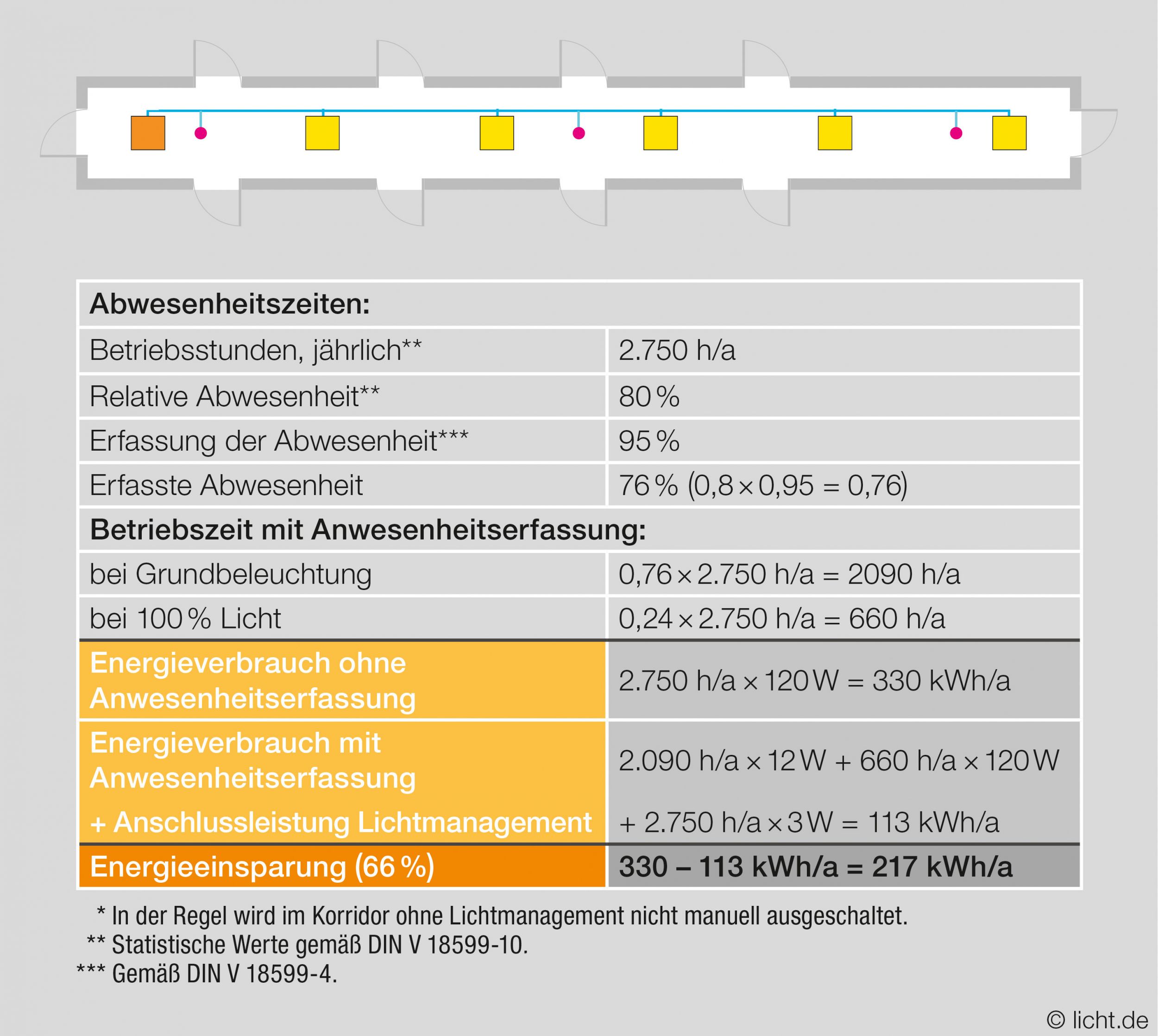 Korridore werden oft nur unregelmäßig genutzt. Eine dauerhafte Beleuchtung ist dann nicht sinnvoll. Flure und Treppen sind nach DINV18599-10 Verkehrsflächen. Mit einer hohen relativen Abwesenheitsrate von 80 Prozent sind sie für energiesparenden Lichteinsatz prädestiniert, idealerweise per präsenz- und bewegungsgesteuerter Beleuchtungsregelung. Im Beispiel der Grafik lässt sich mit
