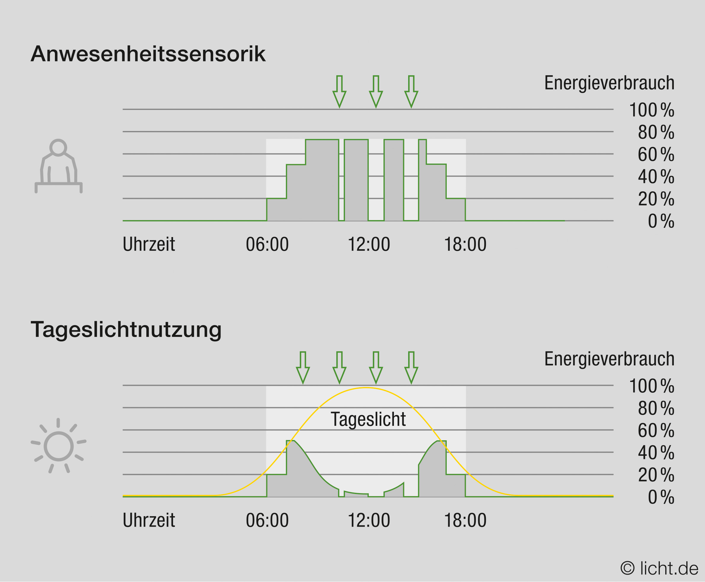Zum modernen Lichtmanagement gehören verschiedene Bausteine, die in unterschiedlichen Ausbaustufen und kombiniert eingesetzt werden können: abrufbare Lichtszenen, Bewegungsmelder, Tageslichtsteuerung, Lichtsensoren an Arbeitsplatzleuchten, im Raum und für den Außenbereich. Jede einzelne Maßnahme zum intelligenten Lichtmanagement trägt zur Energieeinsparung bei. Sensoren haben unterschiedliche Aufgaben: Sie erfassen oder messen das Tageslicht, Präsenz oder Bewegung. Bei der Montage müssen zum Beispiel Montagehöhe und Raumgröße, Erfassungsgeometrie sowie klimatische Besonderheiten beachtet werden.