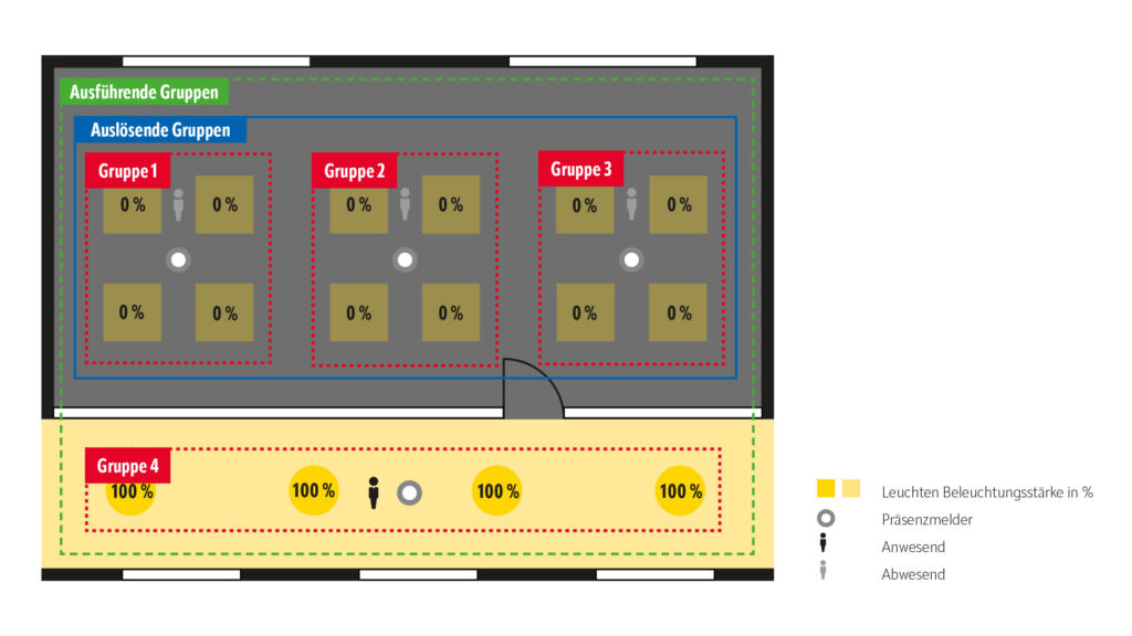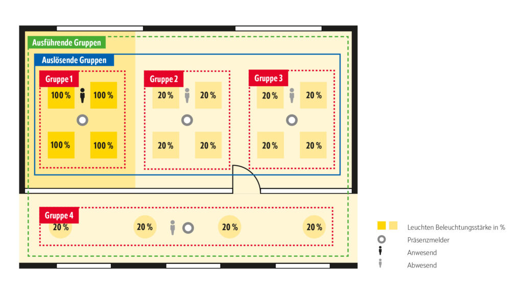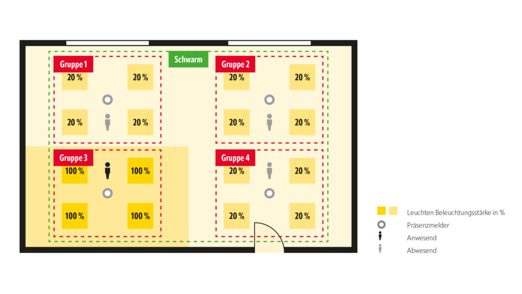 Bei der Konfiguration der Schwarmfunktion besteht auch die Möglichkeit, zwischen auslösenden Gruppen und ausführenden Gruppen zu unterscheiden. Erstgenannte lösen die Schwarmfunktion aus, sobald sie in ihrem Bereich menschliche Präsenz erkennen. Aber nur im Bereich der ausführenden Gruppen wird dann eine gedimmte Grundbeleuchtung aktiviert – sofern dort niemand anwesend ist und es dann die volle normativ geforderte Beleuchtungsstärke braucht. In Beispiel 1 sind auslösende und ausführende Gruppen identisch. Dort soll jede menschliche Präsenz im Raum die gedimmte Grundbeleuchtung in allen unbesetzten Bereichen desselben Raums aktivieren. Doch es können sich auch andere Konstellationen ergeben, wie in Beispiel 2. Wieder geht es um ein Mehrpersonenbüro. Mit einbezogen wird diesmal aber der angrenzende und nur durch eine Glaswand vom Büro getrennte Flur.