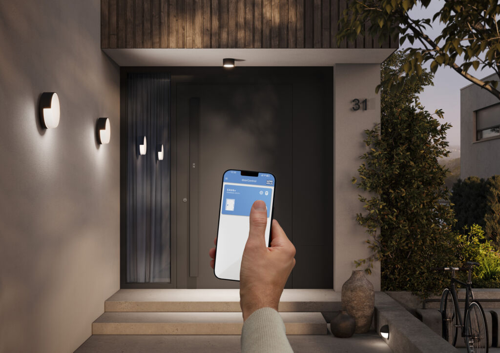 Via App lassen sich die motorischen Sicherheits-Tür-Verriegelungen von Winkhaus öffnen, die ein ‚+‘ im Namen tragen. Diese Lösungen beinhalten ein Funkmodul, das in dem Motorkasten integriert ist. Damit wird die Tür über die App DoorControl entriegelt. Das Smartphone wird so zum Türöffner. Dies geschieht aus der Nähe über Bluetooth oder WLAN. Zusätzliche Installationen und Steuerungsmodule sind nicht erforderlich.
